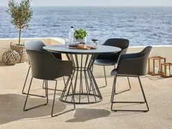 Bord: Stål och fibercement. Ø110 x H75 cm. Stol: Stål och formgjuten, UV-skyddad plast.