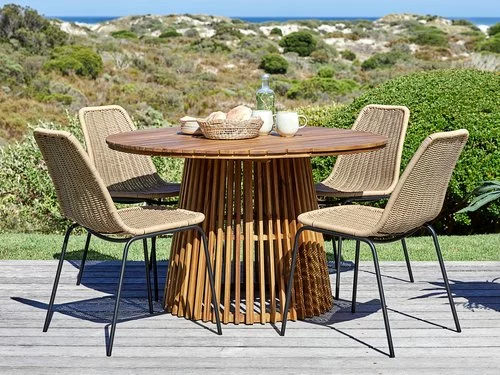 Bord: Oljat FSC® hårdträ. Ø120 x H74 cm. Stol: Stål och konstrotting.
