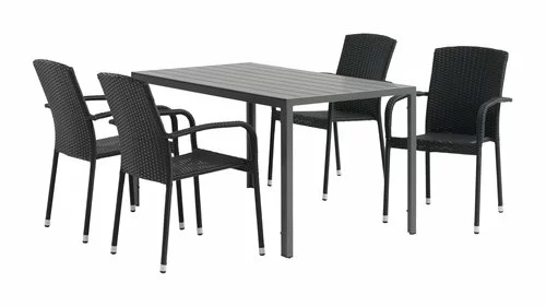 Bord: Aluminium och konstträ. B80 x L140 x H74 cm. Stol: Stål och konstrotting. Stapelbar.