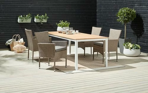 JUTLANDIA YTTRUP L150 Bord Hårdträ + 4 MADERNE Stapelstol Grå