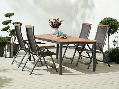 Aluminium och oljat FSC® hårdträ. Inkl. 1 klaff, som kan förvaras under bordsskivan. B100 x L210/300 x H75 cm