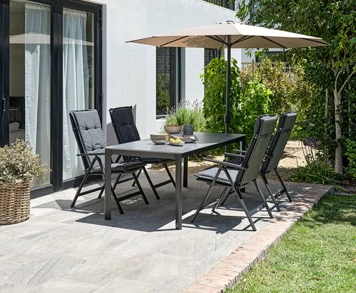 JUTLANDIA YTTRUP L150 Bord Hårdträ + 4 MADERNE Stapelstol Grå