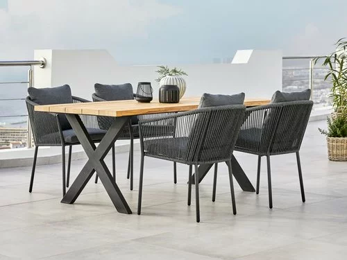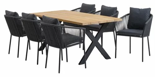 Bord: Galvaniserat stål och massiv FSC® teak. B85 x L180 x H74 cm. Stol: Aluminium och polyester. Inkl. exklusiva dynor med snabbtorkande, strukturvävt överdag. Överdraget har ett vattentätt skikt på insidan, som hindrar vatten från att komma in i dynan. Stapelbar.