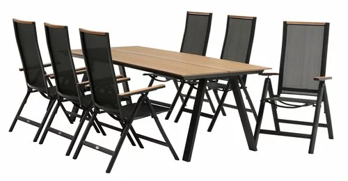 Bord: Aluminium och konstträ. B100 x L220 x H74 cm. Stol: Aluminium och textilene. 6 positioner. Hopfällbar.