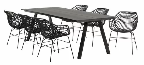 Bord: Aluminium och konstträ. B100 x L220 x H74 cm. Stol: Stål och konstrotting.