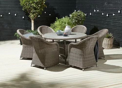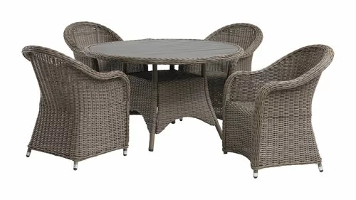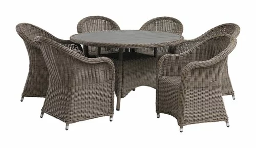 Bord: Aluminium, konstrotting och konstträ. Ø130 x H74 cm. Stol: Aluminium och konstrotting.