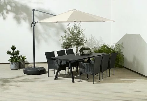 Vattentålig, UV-skyddad polyesterduk och aluminiumstång. Med tiltfunktion, handvev och ventilation. Inkl. vattentåligt överdrag och fot. Ø300 x H245 cm