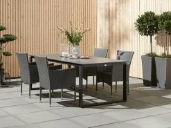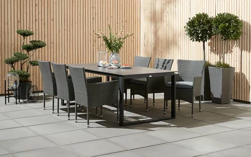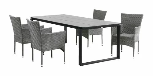 Bord: Aluminium och DURAWOOD® kompositträ, ett slitstarkt kompositmaterial som består av FSC® hårdträfiber och plast. B100 x L215 x H75 cm. Stol: Stål och konstrotting. Stapelbar.