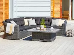 Bord: Aluminium, DURAWOOD® kompositträ och konstrotting. DURAWOOD® är ett slitstarkt kompositmaterial som består av FSC® hårdträfiber och plast. Justerbar höjd. B121 x L121 x H44/67 cm. 5-sits soffa: Aluminium och konstrotting. Kan ej spegelvändas. Inkl. exklusiva dynor med slitstarkt, strukturvävt överdrag.