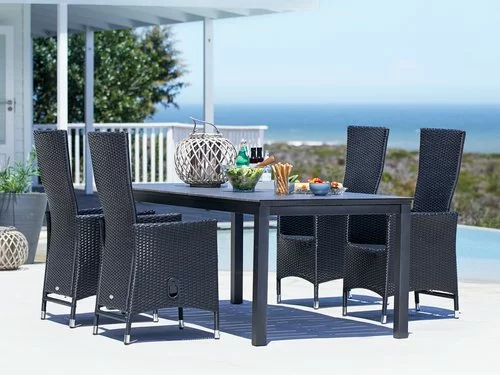 Bord: Aluminium och DURAWOOD® kompositträ, ett slitstarkt kompositmaterial som består av FSC® hårdträfiber och plast. Inkl. 2 klaffar som kan förvaras under bordsskivan. B95 x L214/315 x H77 cm. Stol: Aluminium och konstrotting. Med steglös ryggjustering.
