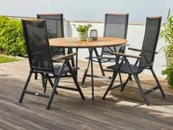 Bord: Aluminium och konstträ. Ø130 x H74 cm. Stol: Aluminium och textilene. 6 positioner. Hopfällbar.