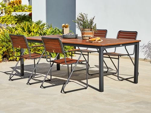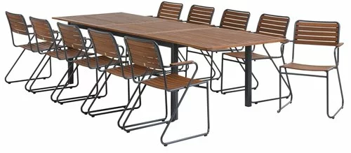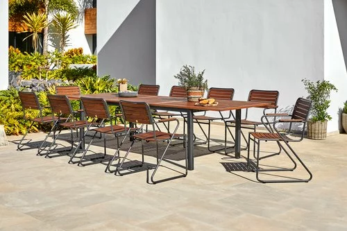Bord: Aluminium och oljat FSC® hårdträ. Inkl. 1 klaff, som kan förvaras under bordsskivan. B100 x L210/300 x H75 cm. Stol: Aluminium och oljat FSC® hårdträ. Stapelbar.