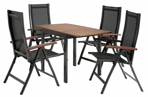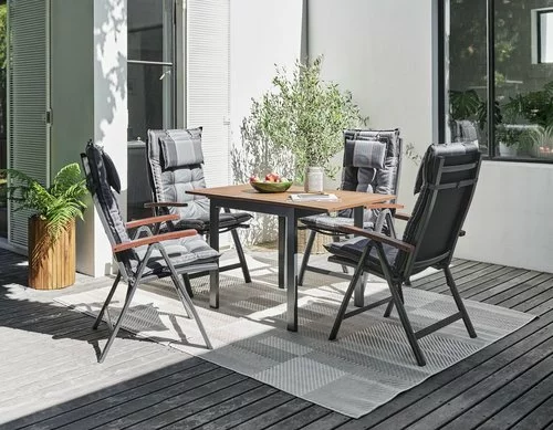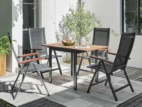 Bord: Aluminium och oljat FSC® hårdträ. Med 1 klaff. B70 x L75/126 x H75 cm. Stol: Aluminium, textilene och oljat FSC® hårdträ. 6 positioner. Hopfällbar.